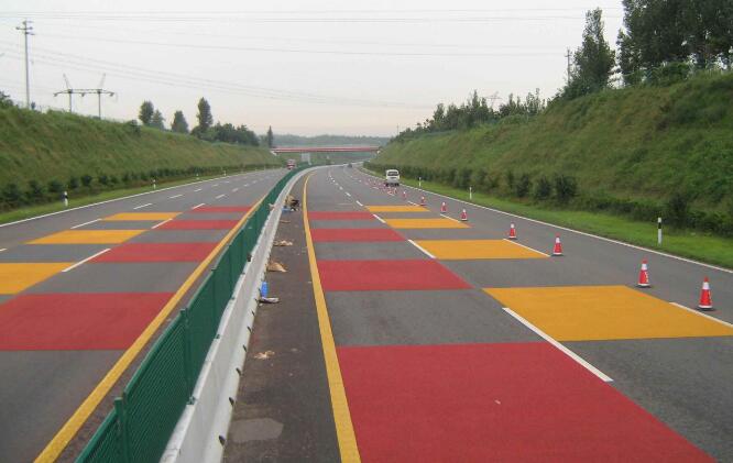 5.互通立交、服务区出入口匝道互通式立交、服务区出口处冈视线不良或立交匝道技术标准较低时,可设置彩色蹄而,提醒驾驶者提前减速。