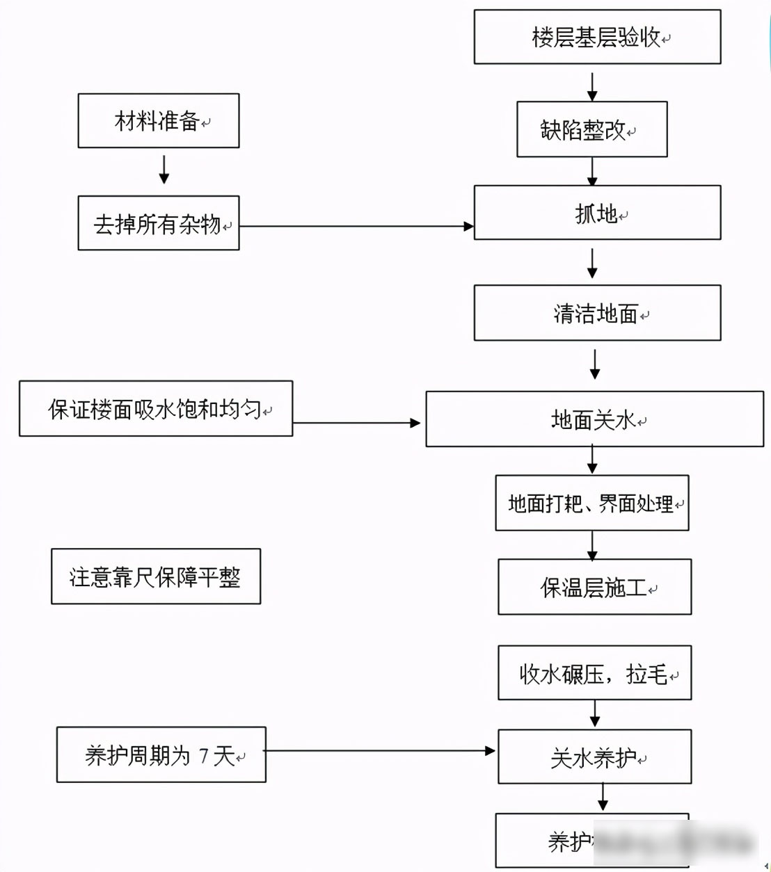 排水立管管根、地漏防水、厨卫防水层施工→泼水试验合格→基层清理、凿毛→找标高冲筋贴灰饼→提前两天关水润湿基层→楼板裂缝检查、标记→裂缝处理→润湿基层及基层处理→铺全轻混凝土→刮杠找平并第一次收平→碾压提浆并第二次收平→表面拉毛处理→养护→切缝→验收