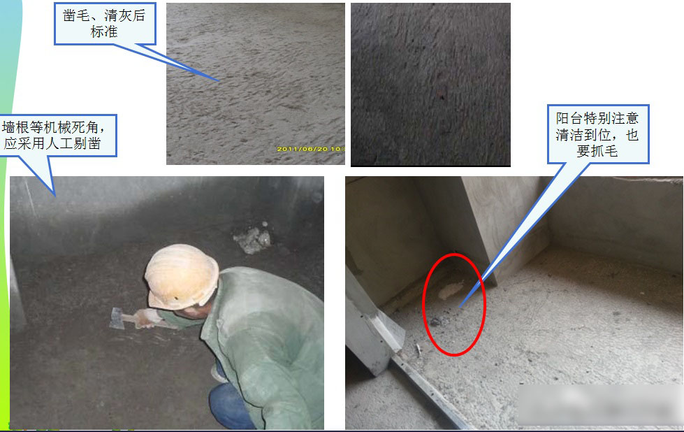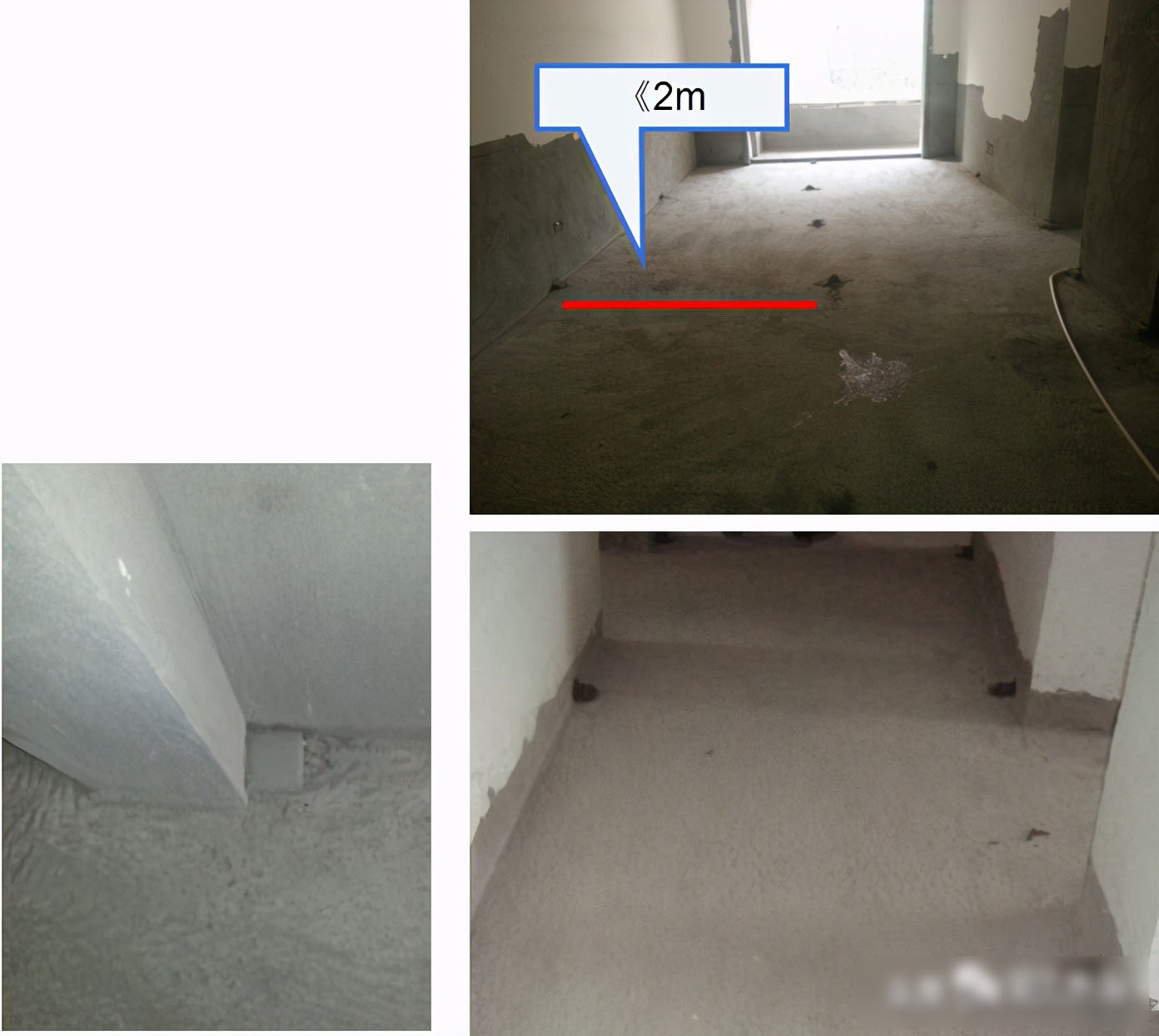 1)沿房间四周墙体根部预留200mm宽度不做拉毛处理,便于今后刷踢脚线在地面做翻边处理;