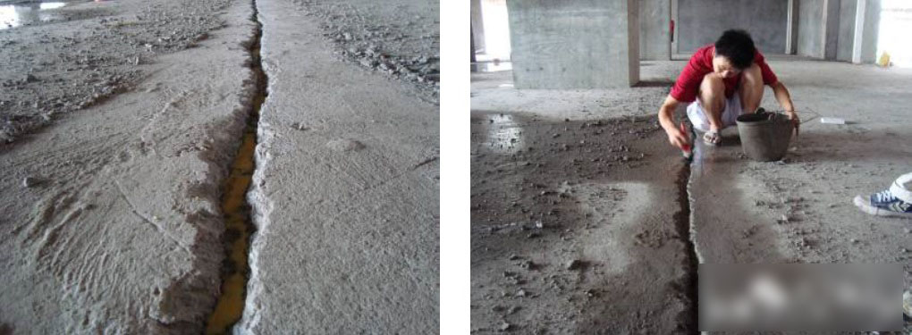 线状裂缝沿裂缝剔槽20mm深,20~30mm宽,用清水冲洗干净,晾干后涂刷环氧树脂砂浆补平裂缝槽。