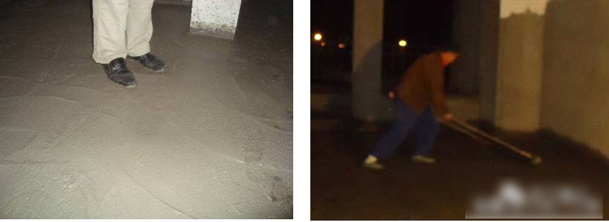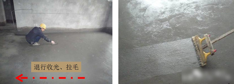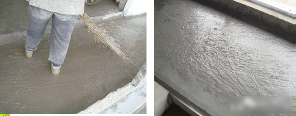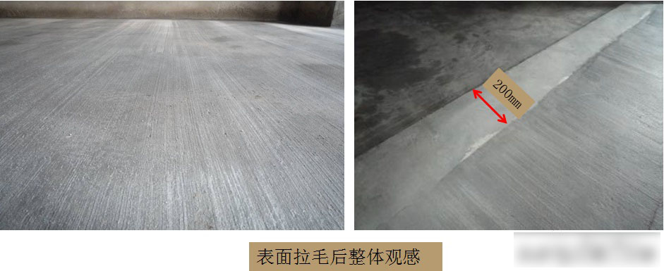 表面拉毛处理:收平压光方向应退步进行,避免踩踏。收光的同时,需要用毛刷对表面进行拉毛处理,拉毛时用力应均匀,每次拉毛的方向、长度应保持一致。并应在旁边准备清水一桶,随时对刷子进行清洗,避免拉毛时刷子上粘上过多水泥浆,影响拉毛效果。