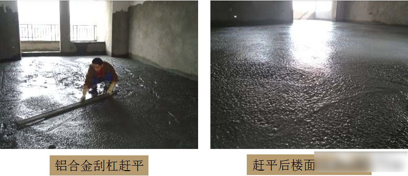 混凝土布料后,用2.5米铝合金尺枋依“灰饼”赶平混凝土,然后用铁板进行初步收平。