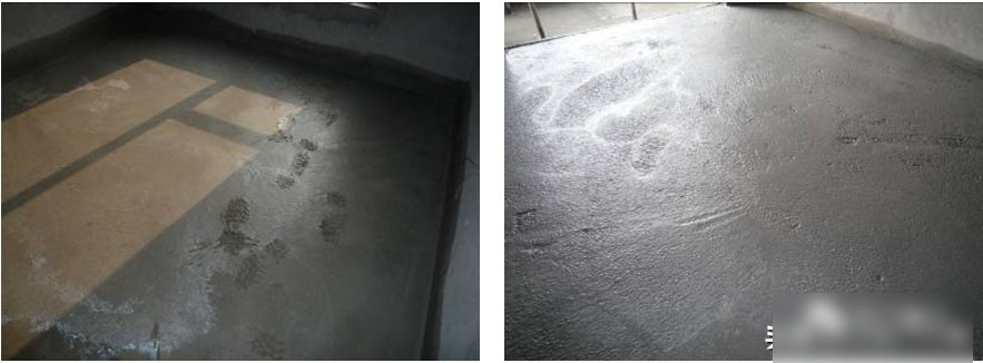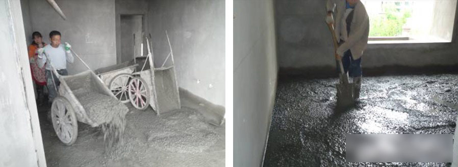 楼面在布料前,应先根据楼面积水情况,铺撒适量干水泥(水灰比控制在0.4~0.5),并采用大扫帚来回扫浆,确保基层水泥浆均匀、成活后程黏稠状,并清理掉表面多余积水,水泥浆结合层随扫随浇。