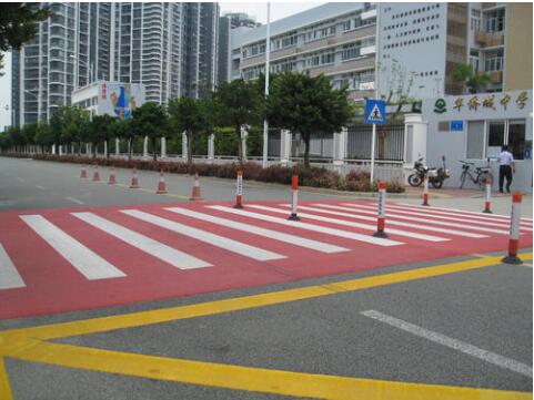 铺设不同颜色的道路可以直观地向司机发出信号。例如,在交通事故频繁的地区,可以修建红色或黄色道路,直观地提醒司机小心驾驶。在通过中小学校园的道路上,修建红色路面,使车辆减速减速,避免危险的发生。在高速公路的弯道、下匝道、隧道出入口段,按一定宽度横向设置彩色防滑减速带,以防止路面滑行和减速,并采用不同的颜色使其清新、醒目,提高行车安全性。
