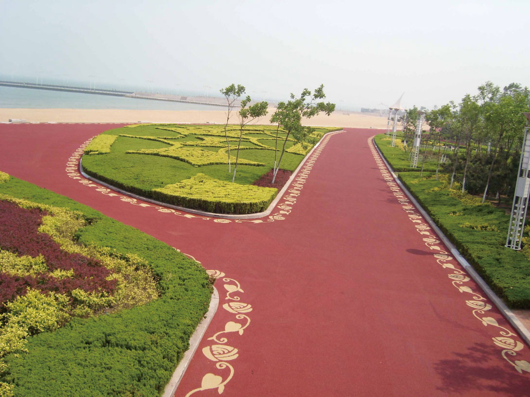 六.由于彩色透水地坪里面的水泥浆稠度较大,成分却不多,因此为了让水泥浆能够充分的包裹住骨料上,需要进行为期五分钟的搅拌,当然是用机器搅拌五分钟。因为透水地坪拌合物比较干硬,在浇筑之前,为了不让透水地坪快速失水我们应在在路基上面进行水润湿处理,处理好后把搅拌好的透水地坪材料铺平即可。、然后便是振捣,一般情况下我们使用板振动器轻振铺平后的透水性混凝土混合料,振捣完成后以后考虑到拌合料的稠度和周围温度等条件可能需要多次辊压(注意清洁理辊子,以防粘结骨料)/